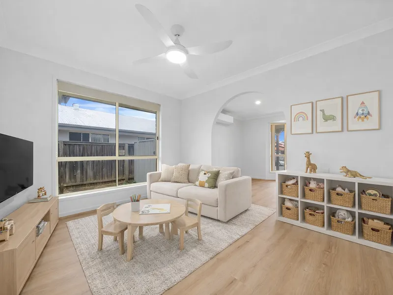 The open plan kitchen and dining area flows seamlessly onto a huge 5m x 6m covered entertaining area with outdoor ceiling fan, making it the ideal space for entertaining family and friends. Inside, the main lounge connects to a second flexible living space that could easily be used as a kids’ retreat, home office or formal dining room.