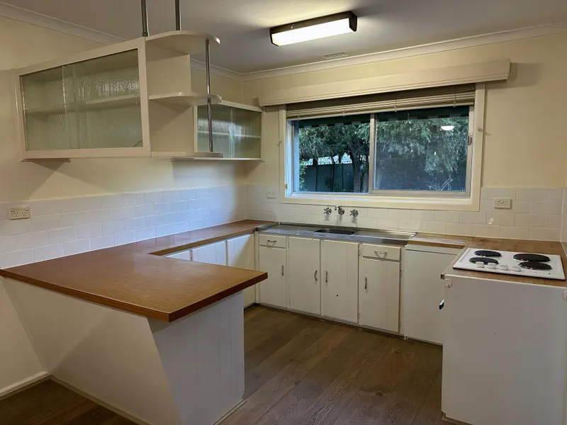 Inside, double-sliding doors open to a large living room with front garden views, natural light, and reverse-cycle heating/cooling. The kitchen and dining area includes a new oven, with flexible space for fridge and pantry storage. A spacious laundry connects to a rear deck overlooking established gardens.