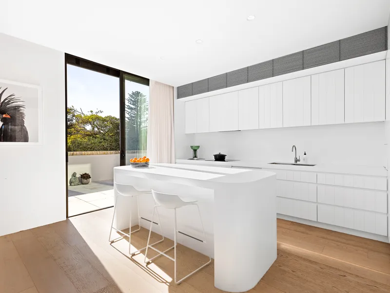 Flooded with natural light, this remarkable residence showcases a sleek, modern design with an open-plan kitchen, living, and dining space that effortlessly flows out to a spacious terrace.