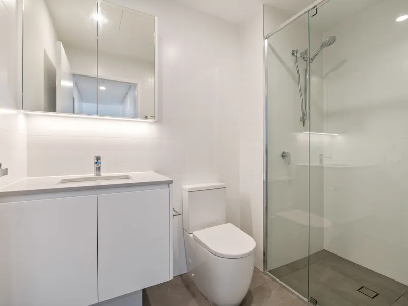 This two-bedroom, two-bathroom residence with one secure car space showcases premium materials and high-quality fixtures throughout. The elevated design features natural stone benchtops in the kitchen, bathrooms, and ensuite, complemented by a sophisticated palette that exudes modern elegance.