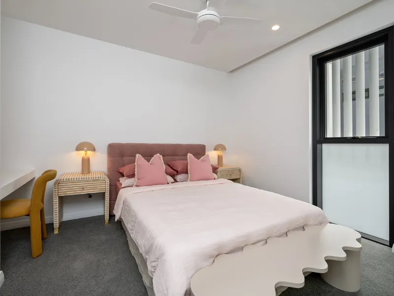 This three-bedroom, two-bathroom residence with two secure car spaces showcases premium materials and high-quality fixtures throughout. The elevated design features natural stone benchtops in the kitchen, bathrooms, and ensuite, complemented by a sophisticated palette that exudes modern elegance.
