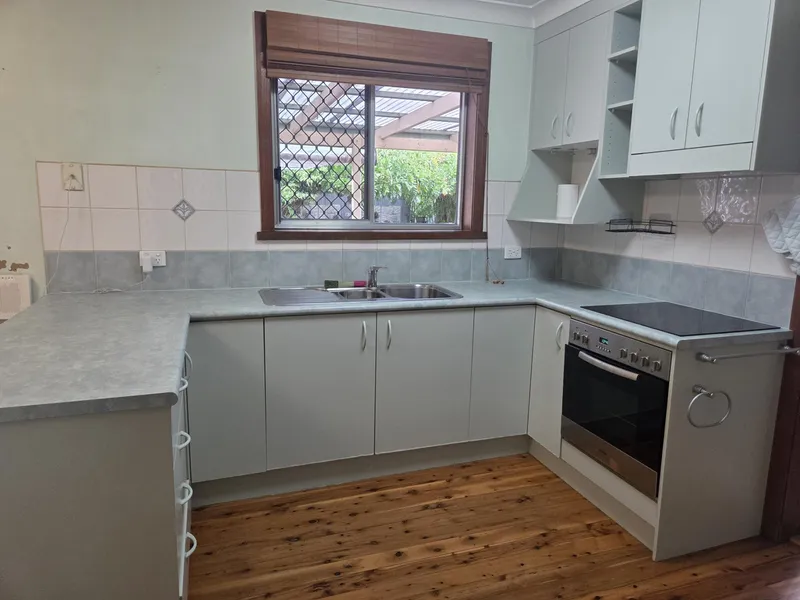 The living areas are equipped with heating and cooling for year-round comfort, while the spacious kitchen includes electric cooking and ample storage, flowing into a separate dining area. A full bathroom services the home, complete with a separate toilet for added convenience.