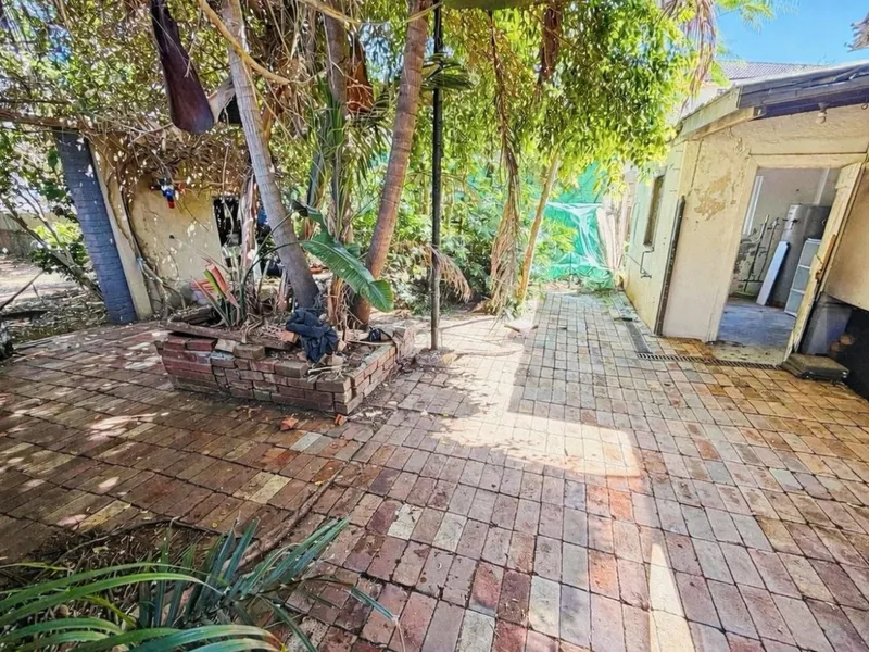 - Outdoor paved courtyard and leafy backyard