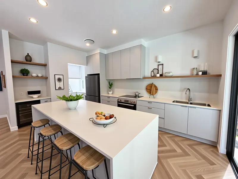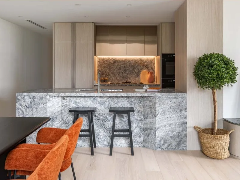 - Sleek kitchen with stone benchtops and integrated appliances including Integrated Fridge