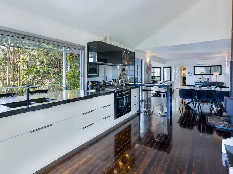 There are multiple living areas set perfectly for relaxation from a library room packed with books to get lost in to garden retreats and a selection of balcony areas. The greenery also meanders down to a rainforest gully on the edge of the property with a 1km private walking/accessible trail where you can enjoy the native flora and fauna.