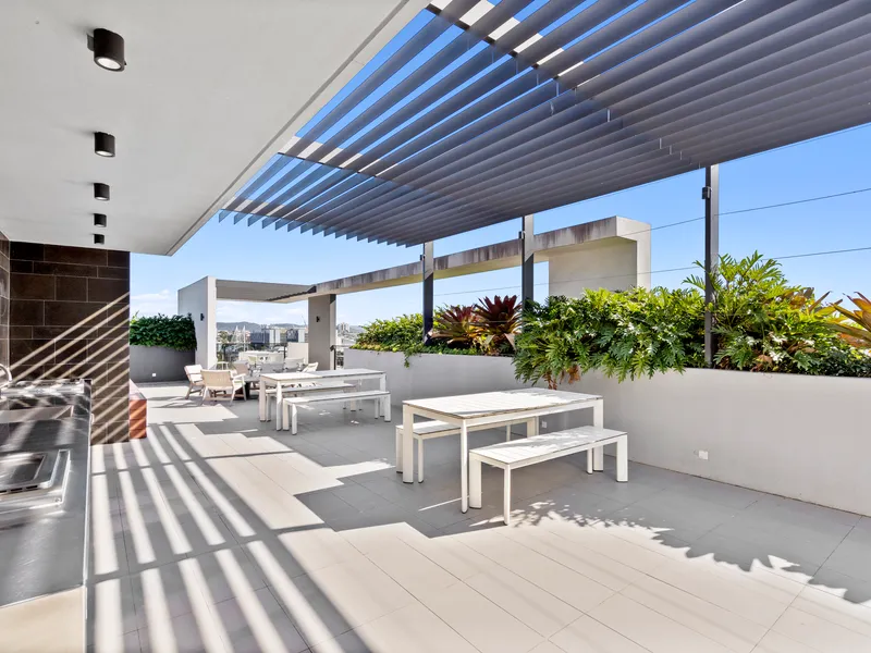 * Resident rooftop facilities with BBQs and multiple dining areas, offering panoramic views of Brisbane and the CBD.