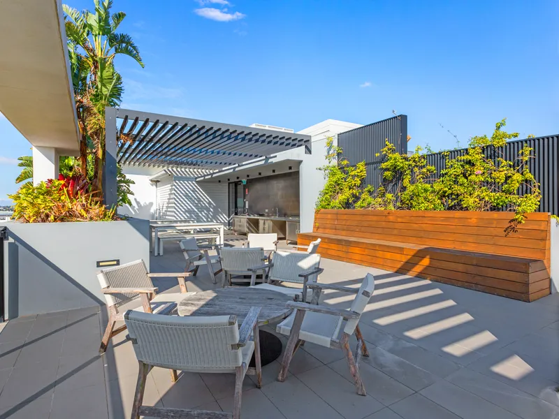 Residents’ rooftop with BBQ's, extensive Dining space, CBD views