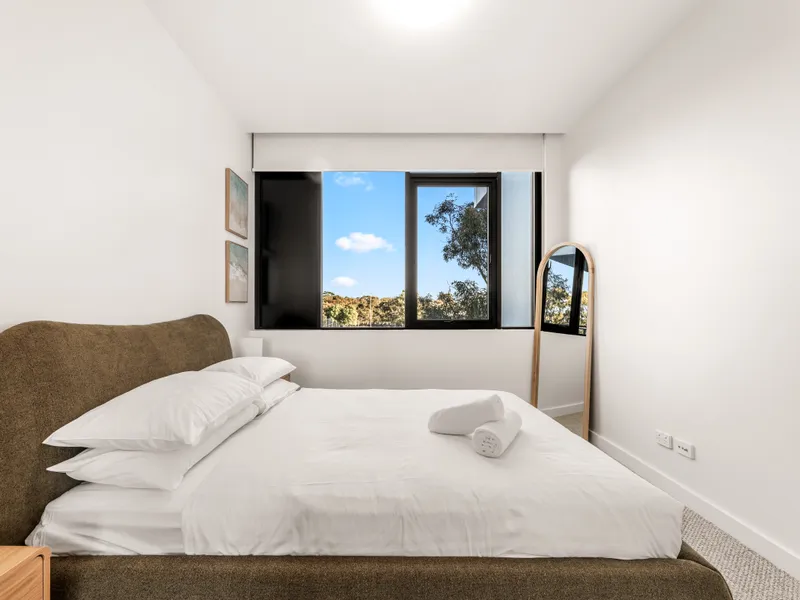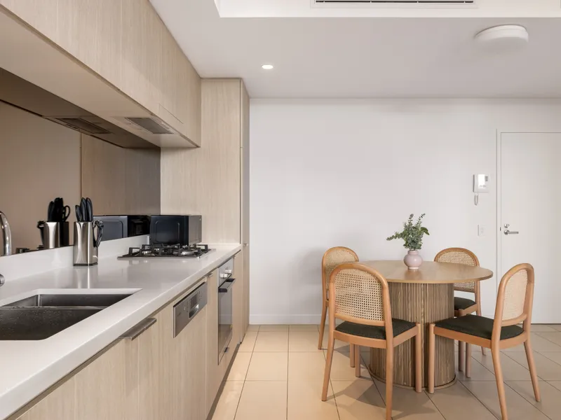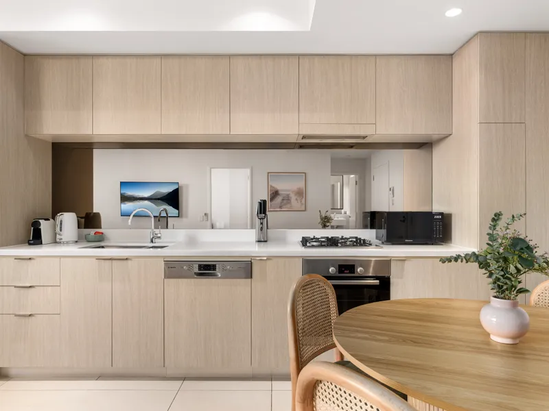 Relax in this bright and spacious 1-bedroom apartment nestled in Woolooware Bay. With shared access to pools, gym, spa, and sauna, it's perfect for couples or singles. Enjoy the breeze from your private balcony or cook up a storm in the fully equipped kitchen. Located steps from Shark Park Stadium and local cafes. Step into a light-filled apartment designed for comfort and ease. The open-plan living area is styled with warm tones, soft textiles, and natural light pouring in from the adjoining balcony. A plush 3-seater couch faces a flat-screen TV with Free-to-Air access, perfect for unwinding after a day out. The kitchen features a Bosch gas stovetop and electric oven, with sleek cabinetry and ample cookware to meet your culinary needs. Enjoy your meals at the dining table that comfortably seats four.