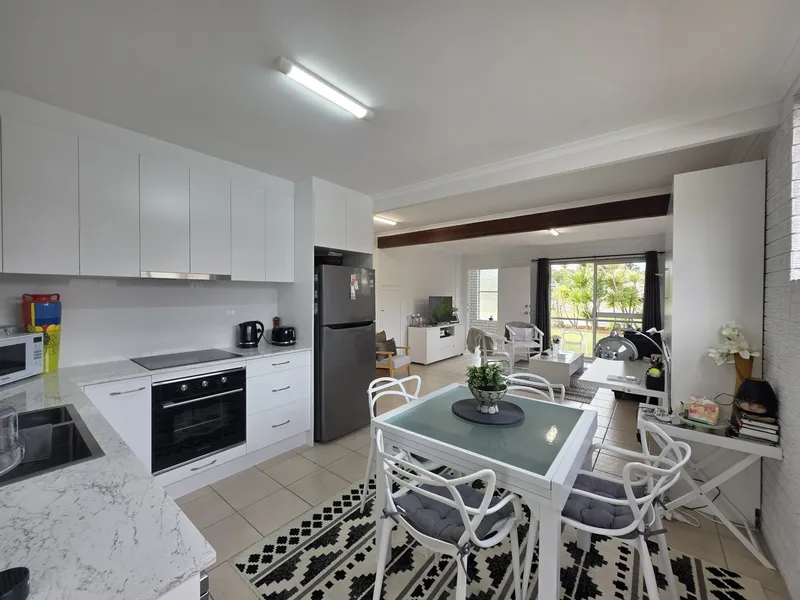 - Open-plan living and dining areas with new reversible, low-profile remote controlled ceiling fan with light provide a welcoming space for family gatherings or entertaining friends