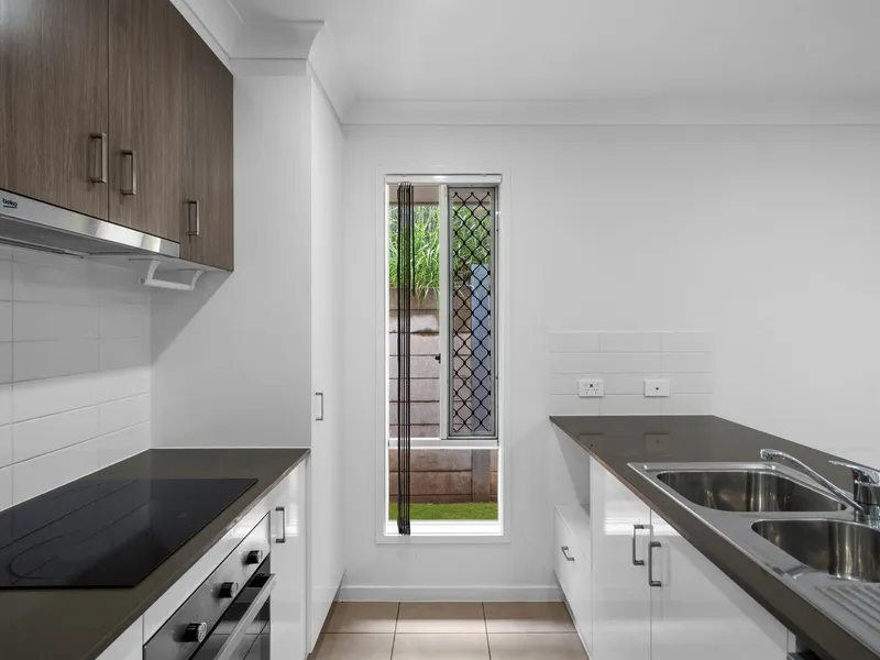 - Modern kitchen with double sinks, microwave alcove, dishwasher and electric cooktop and oven, plus plenty of bench and cupboard space and pantry