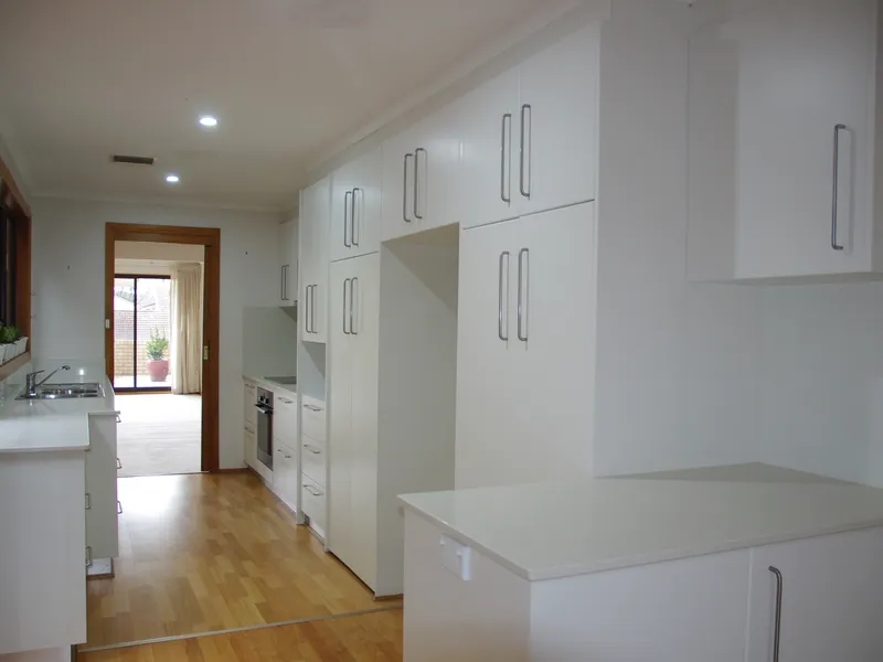 - Kitchen with plenty of storage looking out to tranquil atrium