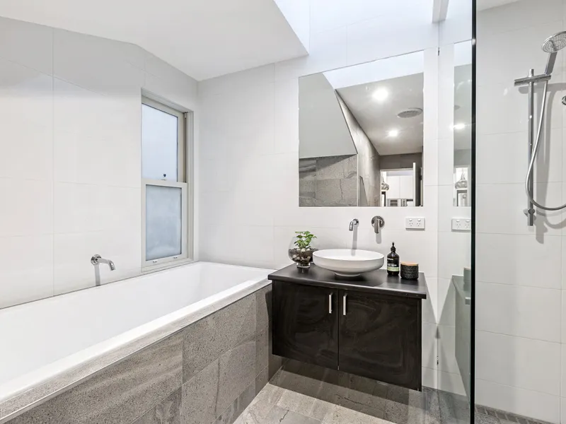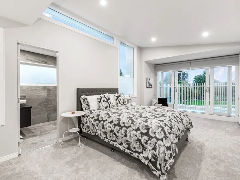 Two large downstairs bedrooms with wall to wall carpet and built in robes serviced by an opulent main bathroom. On the first floor is a magnificent main bedroom, gorgeous ensuite and enviable views over Fels Reserve.