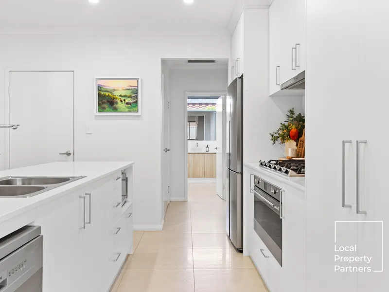 At the heart of the home, the stunning kitchen features stone benchtops and quality Smeg appliances, making everyday cooking and hosting a pleasure. Generous bedrooms and oversized bathrooms, including a luxurious bathtub, provide space to relax and unwind.