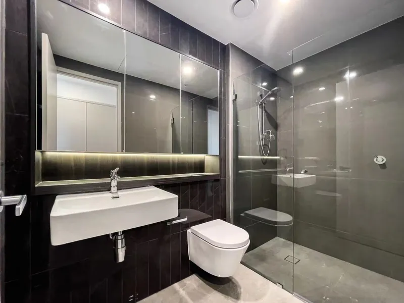 - Bathroom with frameless glass showers & contemporary tiled feature walls