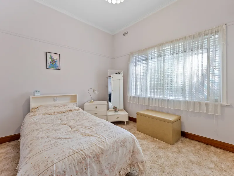 Set on an elevated block with stunning city views, this home boasts original hardwood doors, picture rails, and decorative ceilings. The front lounge features a mantled heater and air-conditioning, while the dining area flows into a neat kitchen with electric appliances and ample cabinetry. A multipurpose sunroom offers flexibility as a home office or a serene sitting area, leading out to a tranquil backyard framed by lush, leafy gardens.