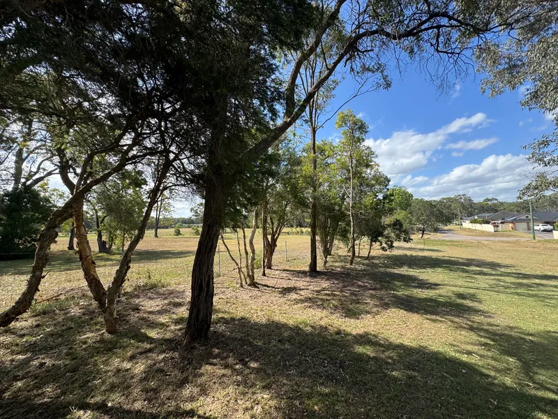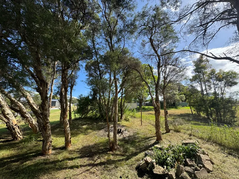The block is partially fenced and features a natural blend of grassed areas, established trees, and shrubs, providing a versatile landscape suitable for storage, small-scale business use, or future possibilities (STCA).