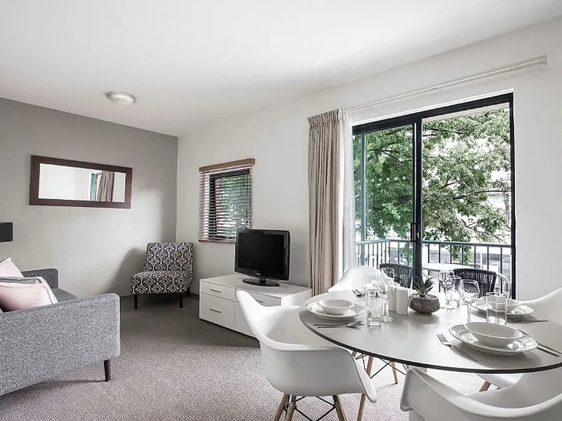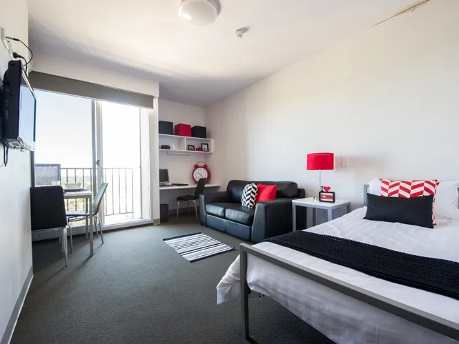 Each studio apartment is fully furnished including their own ensuite bathroom, balcony, reverse cycle air conditioning, microwave oven, hot plates, fridge, single or double bed, telephone line, broadband internet connection, flat screen wall mounted 26? LCD television, dining table and chairs, study desk and chair, lounge, built-in wardrobe and bedside table.