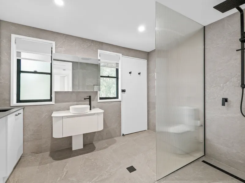 The modern bathroom is cleverly combined with a laundry, creating a streamlined and practical layout.