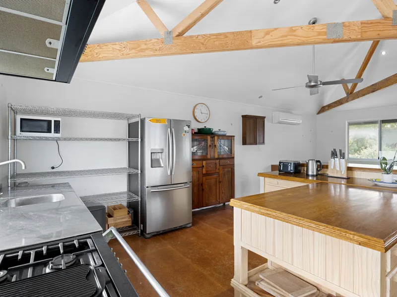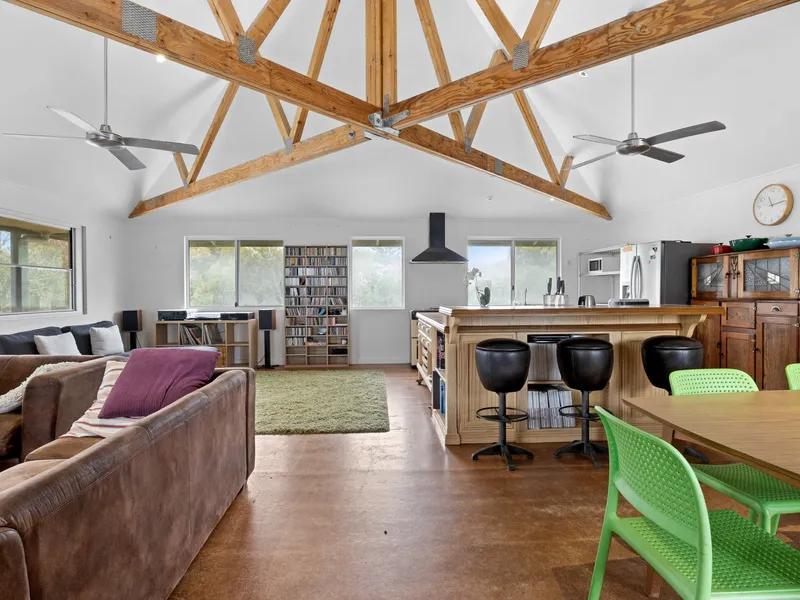Upstairs open-plan kitchen, dining & living with balcony