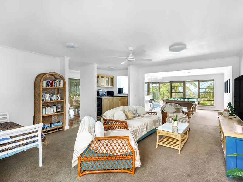 Inside, the home includes a fully equipped kitchen, spacious living and dining areas, and a separate rumpus/games room with a pool table and bar—ideal for entertaining or additional living space.