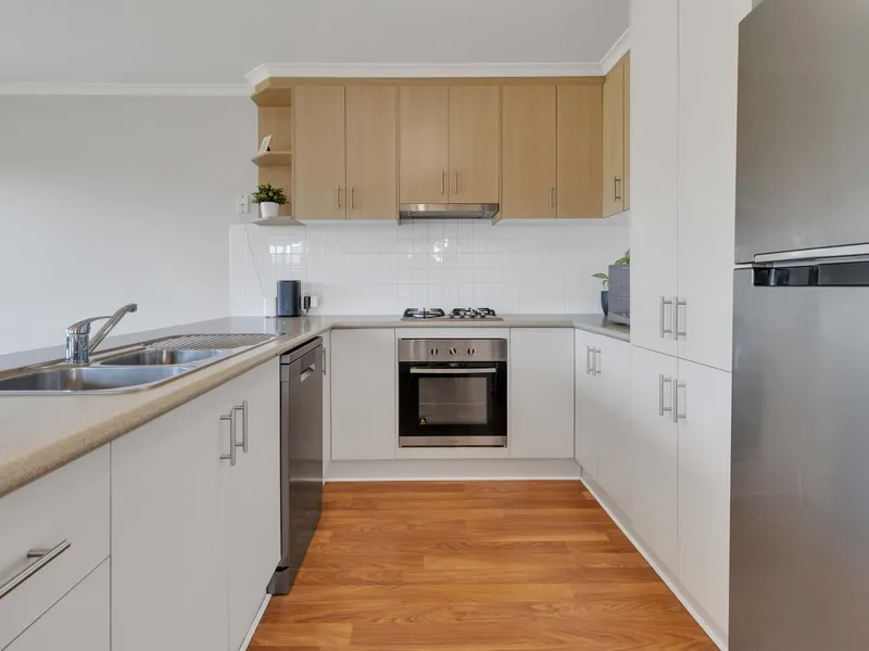 The heart of the home is the open plan living, dining and kitchen area, designed to bring the household together while offering seamless flow for everyday living. The kitchen is well appointed with a four burner cooktop, double sink, dishwasher and ample bench space, catering perfectly to busy family life and casual entertaining.