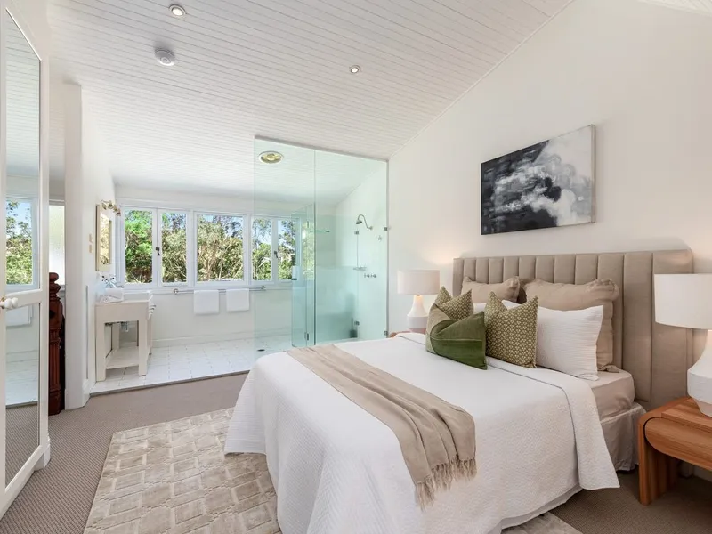 With a seamless indoor-outdoor flow, the residence is designed for effortless entertaining, featuring a generous alfresco area framed by lush greenery. Polished timber floors, abundant natural light from well-placed skylights, and premium finishes throughout create a warm and inviting atmosphere.