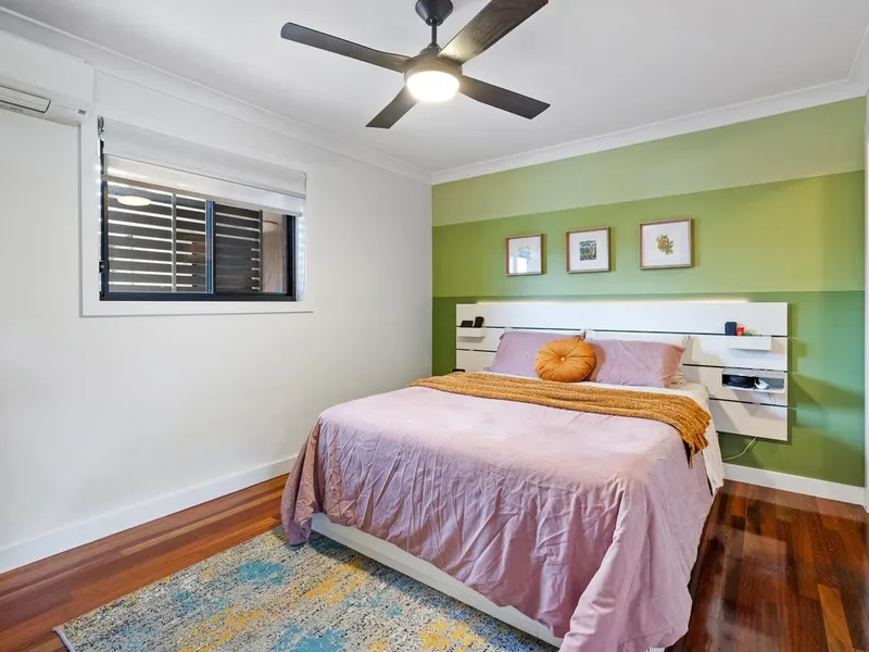 Ascend the stairs to two well sized bedrooms both with air-conditioning, ceiling fans, built-in wardrobes and hardwood floors. One of the bedrooms has a walk-in wardrobe, offering additional storage when needed. A bathroom services the home with a shower and toilet.
