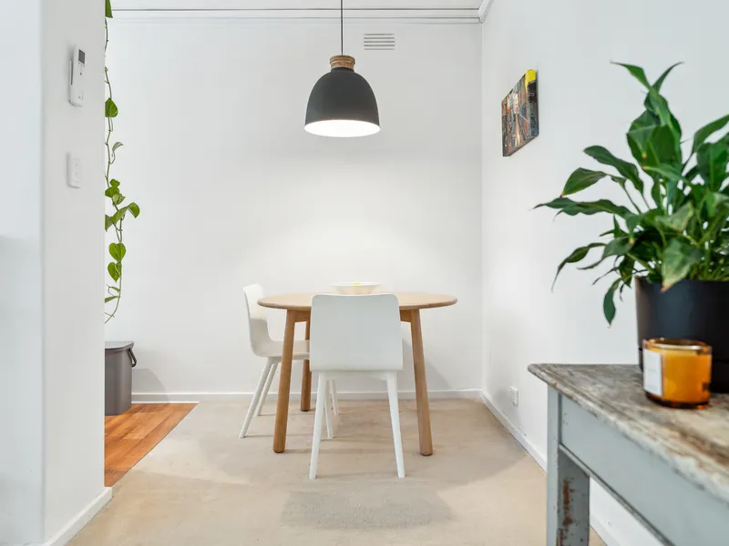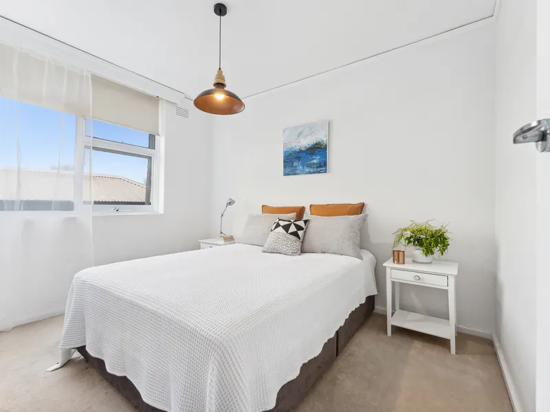 The generous bedroom features built-in robes, while the fully renovated bathroom impresses with floor-to-ceiling tiles and a large walk-in shower. Additional features include split system heating/cooling, secure intercom entry, off-street parking and communal laundry on site, ensuring both comfort and convenience.