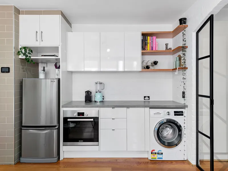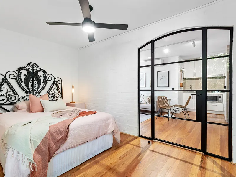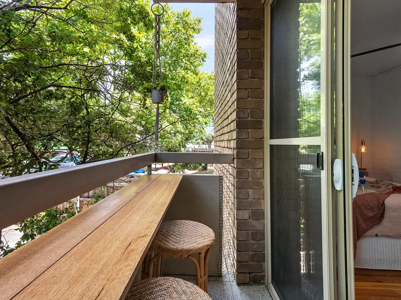 The accommodating open-plan living and dining area is light and airy; while the renovated kitchen is designed to perform with an induction cooktop, Bosch oven, built-in microwave, stone benchtop, custom hardwood ash shelving and integrated laundry. Stunning custom steel and glass doors introduce the spacious double bedroom with built-in robes, while allowing the light and views to flow through the entire interior; while the balcony is gorgeous spot with a custom bar, and terrazzo look tiles.