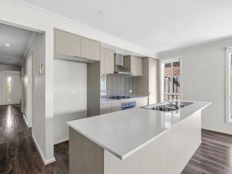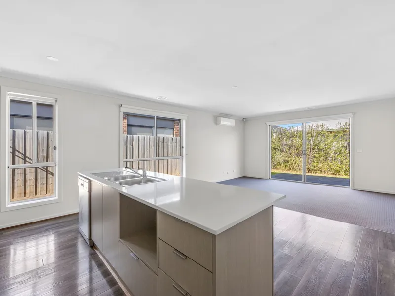 At the heart of the home, the open-plan kitchen, dining and living area provides a welcoming space to relax and entertain. Featuring a sleek stone island bench, stainless steel appliances and ample storage, the kitchen is both stylish and functional. Large windows and sliding doors allow for an abundance of natural light while seamlessly connecting to the rear yard-ideal for easy indoor-outdoor living.