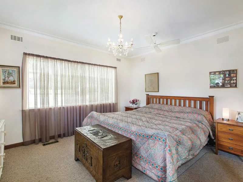 The home features a formal entry, light-filled living and dining area with high ceilings, and an updated kitchen with stone benchtops and casual meals area. There are three double bedrooms with built-in robes, a central bathroom and separate laundry.