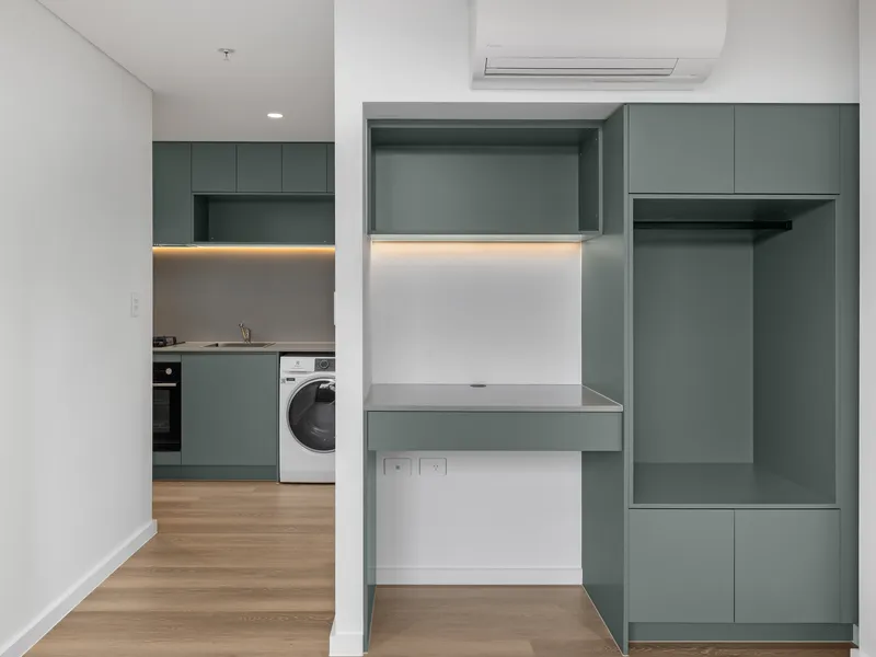 - Dual-function living/dining area features custom joinery with a desk and robe space