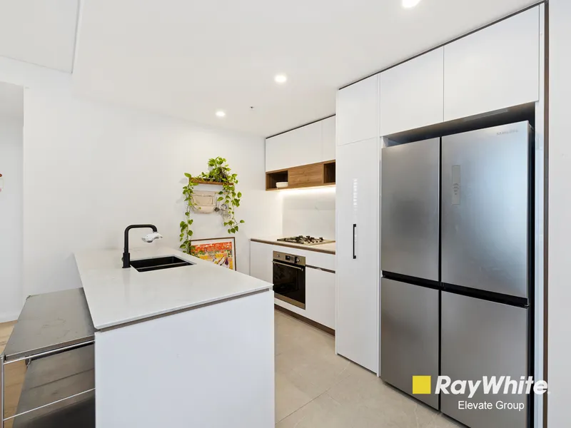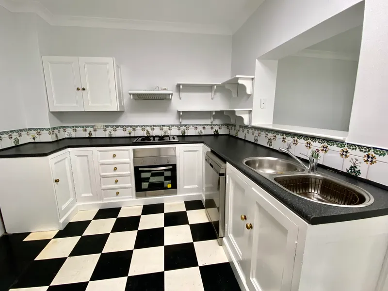 * White timber kitchen with as new gas cook top, oven and a dishwasher