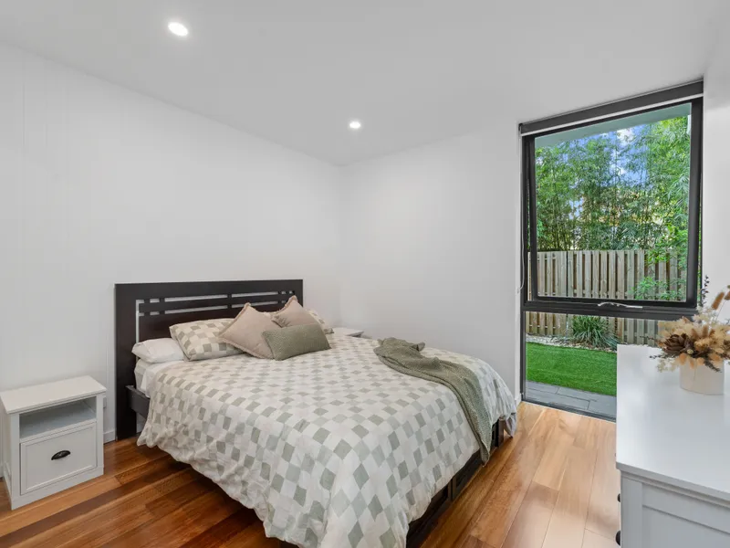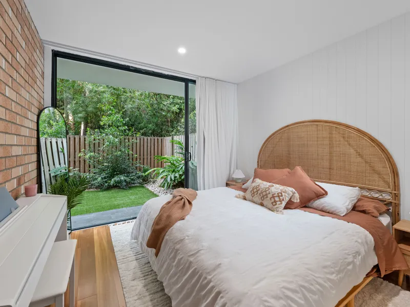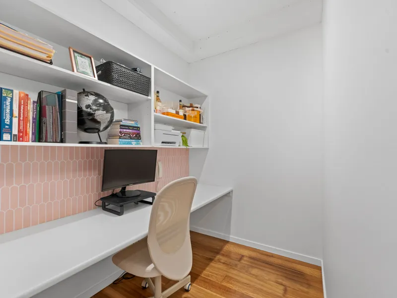 The apartment features a spacious and well-designed layout, with a bright and airy living area that seamlessly flows into the dining and kitchen area. The kitchen is equipped with high-quality appliances and breakfast bar with ample storage. The bedrooms are generously sized. The master has a walk-in-robe and ensuite and the other bedroom has a wardrobe. There is a separate study off the kitchen with a built in desk and bookshelves. Featuring a private fully fenced patio and back garden, it has a leafy and quiet outlook.