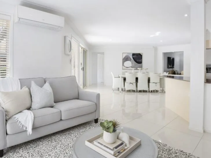 Inside, the home features a light-filled open-plan kitchen, living and dining area, designed for easy everyday living. The lounge room includes air conditioning and a ceiling fan, ensuring comfort year-round.