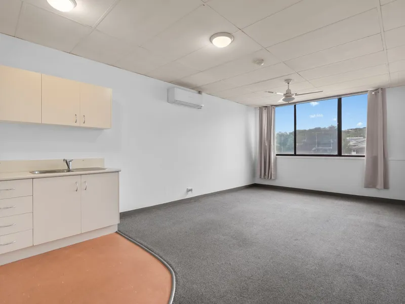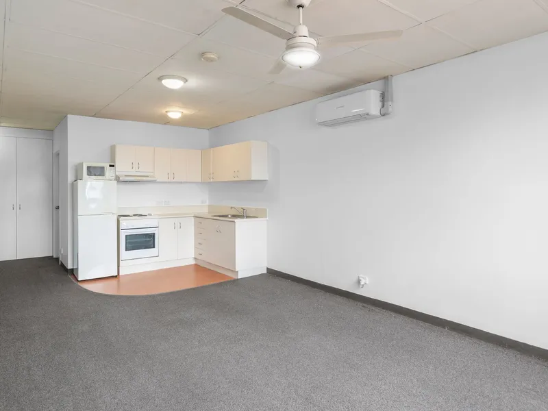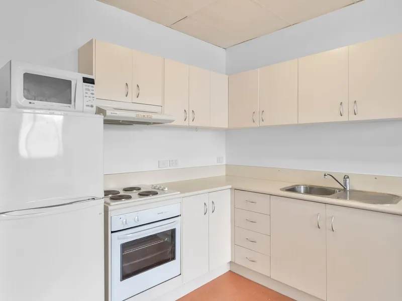 Enter the unit to the studio space, offering a combined and air-conditioned living and bedroom space. A functional kitchen sits off to the side, including an electric cooktop and oven, fridge and ample bench and cupboard space.