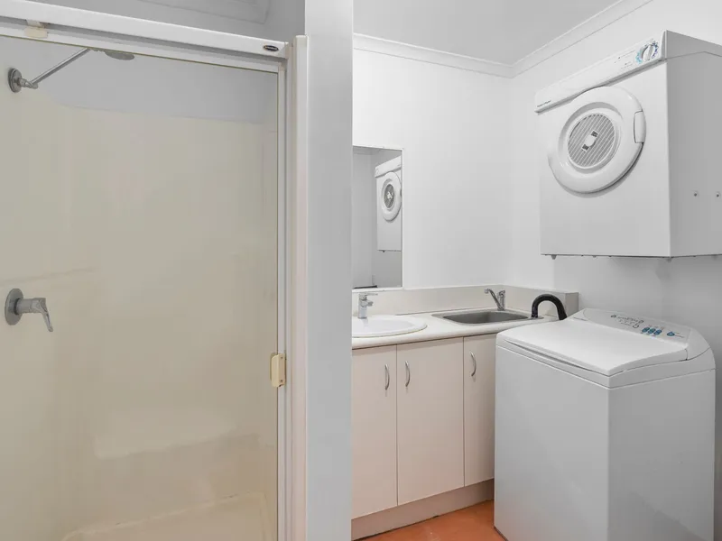 The combined bathroom and laundry are positioned behind the kitchen offering a wall-mounted dryer, washing machine, shower and toilet. For your storage needs there is a wall of built-in cupboards in the entry.