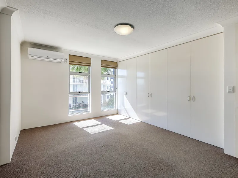 The apartment includes two well-appointed bathrooms - an ensuite to the master and a main bathroom with a bath and shower - along with a private balcony off the living area to take in the surroundings. Additional features include a double garage, intercom access, and easy access to the Bicentennial Bikeway.