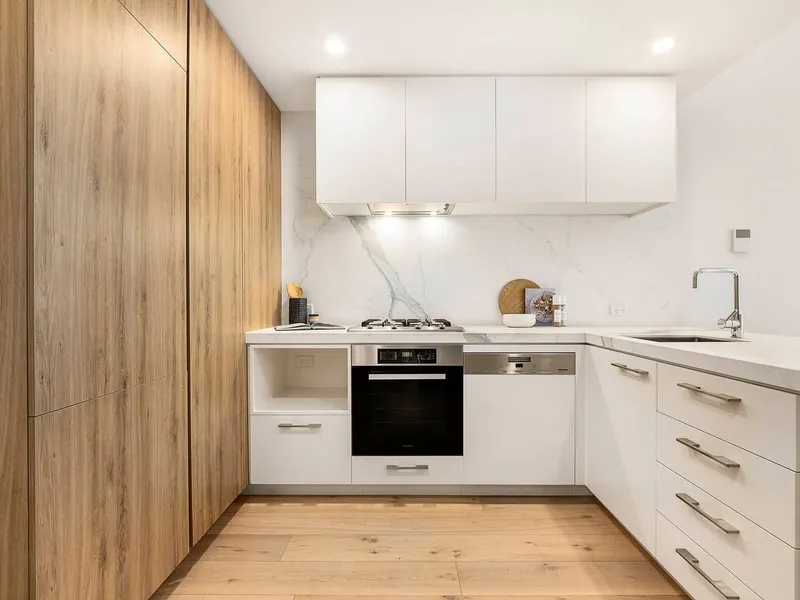 The sleek kitchen is both functional and elegant, complete with quality appliances, stone benchtops, and ample storage.