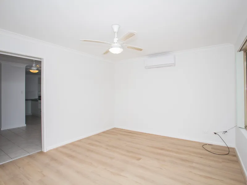 Both bedrooms are well-sized and functional, each featuring built-in robes and newly laid floorboards. The generously sized master bedroom sits peacefully at the rear of the home and includes split-system air conditioning, while the second bedroom also offers the comfort of a ceiling fan.