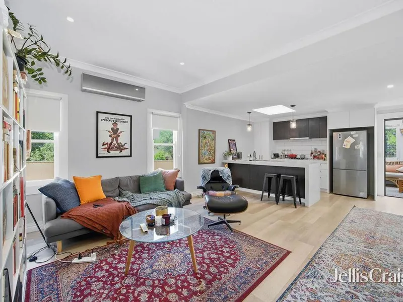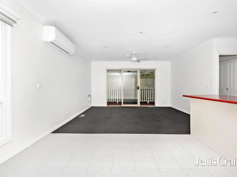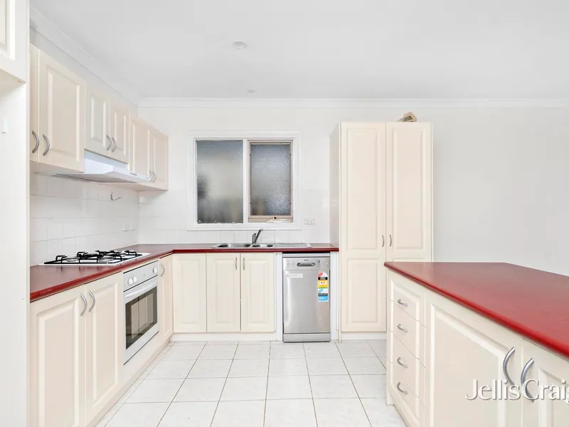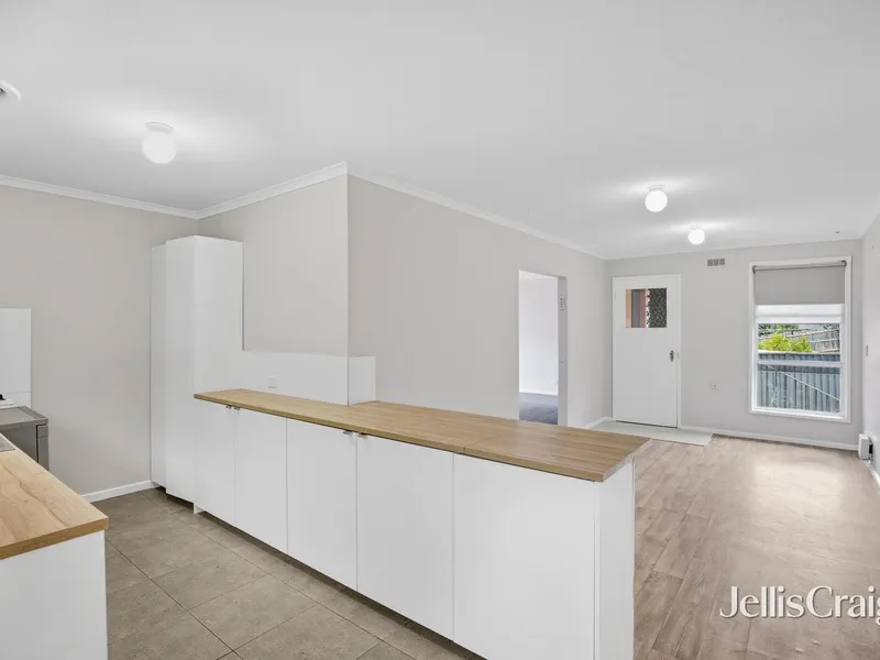 The modern kitchen has been tastefully updated and includes stone benchtops, an oven, and a dishwasher, flowing seamlessly into a light-filled living and dining area designed for everyday comfort.