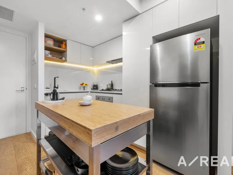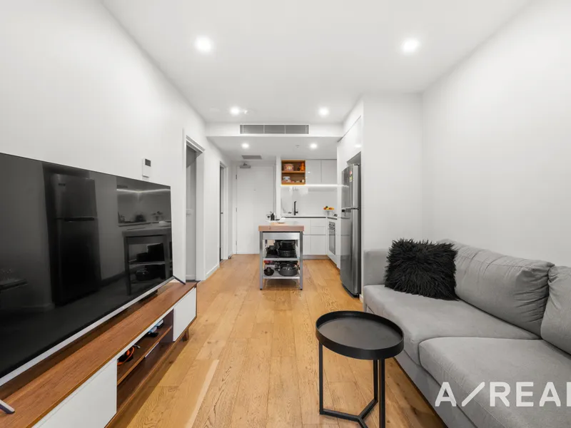 This apartment has great living areas, The designer kitchen runs along one wall with chic black fixtures, sweeping benchtops, strip lighting. On-trend wide-plank flooring combines beautifully with the muted colour tones, statement lighting and feature panelled wall while oversized glass sliding doors.