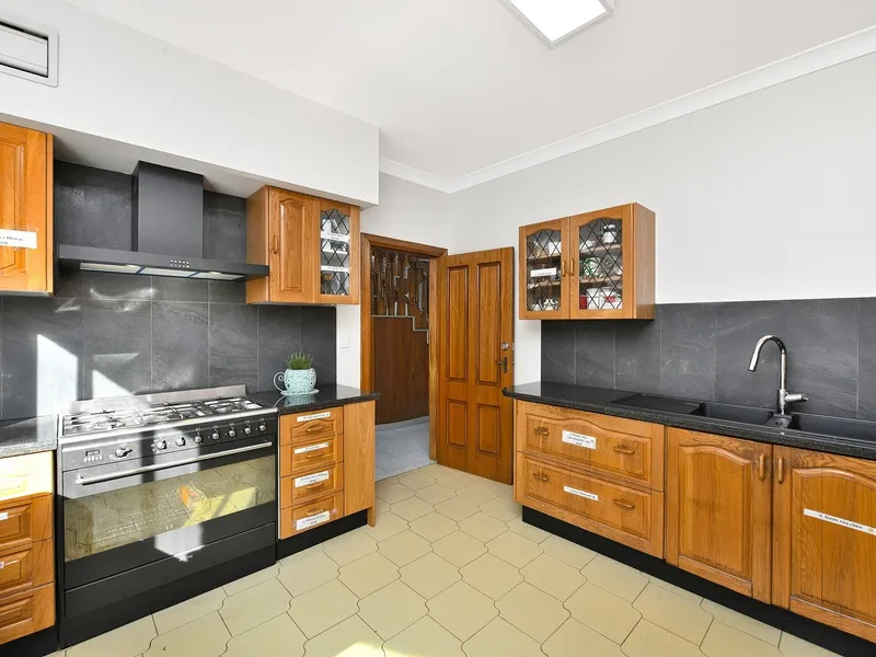 * Spacious modern kitchen with stainless steel and gas appliances.