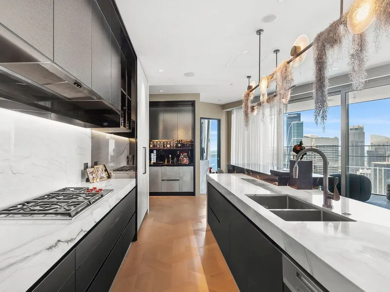 - The kitchen is a standout with Wolf appliances, an integrated Sub-Zero fridge, a marble bar, and a Miele dishwasher.