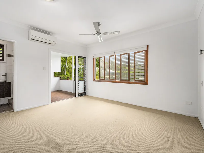 - Master bedroom with en-suite, air conditioning, ceiling fan, built-in wardrobe, and private deck.
