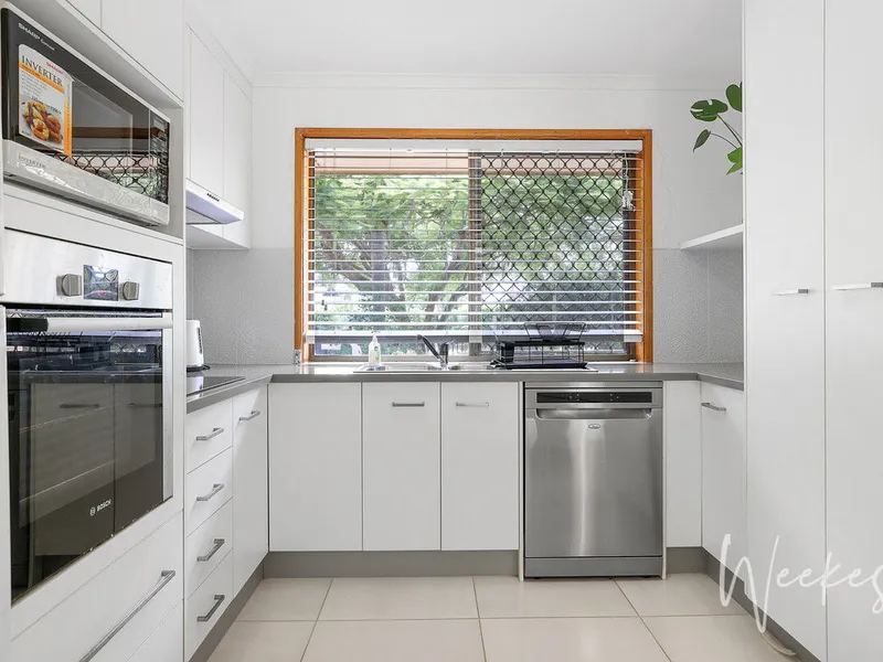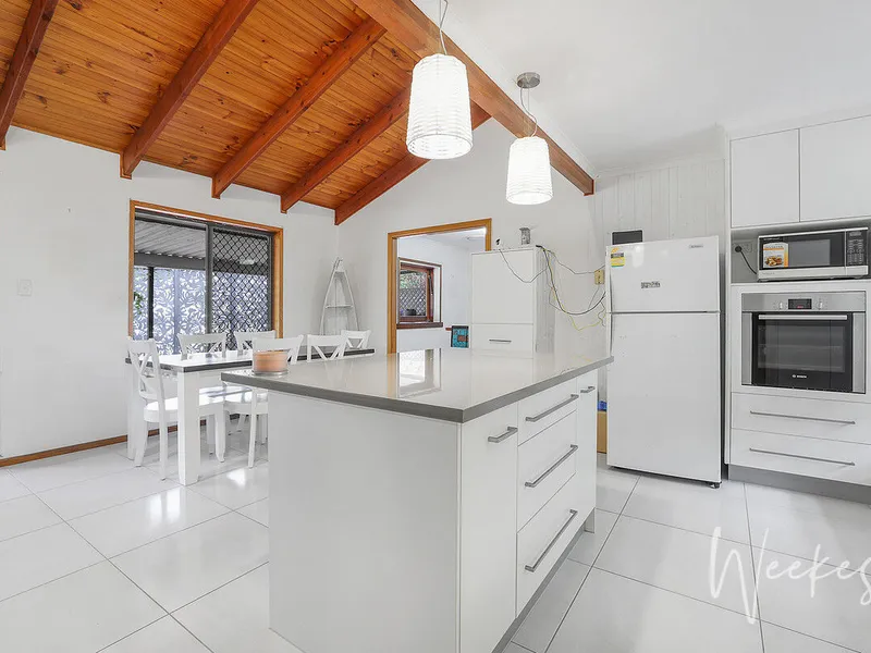 - Kitchen with island bench and electric appliances