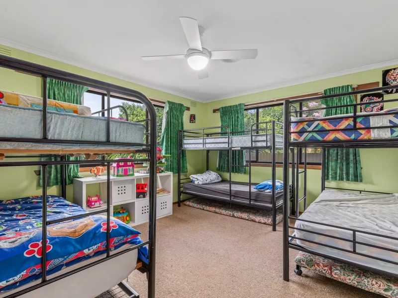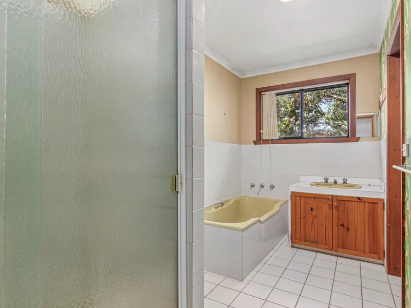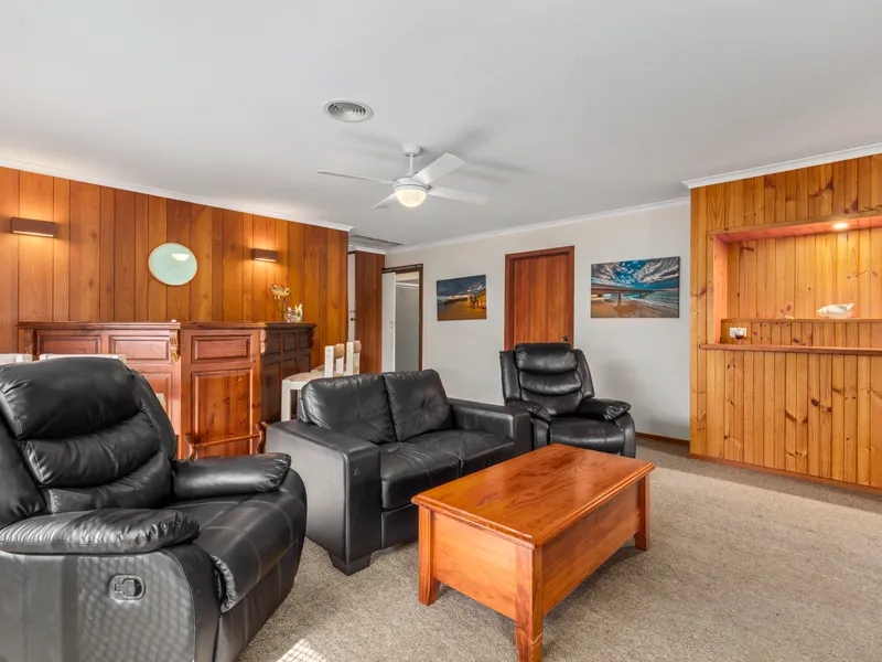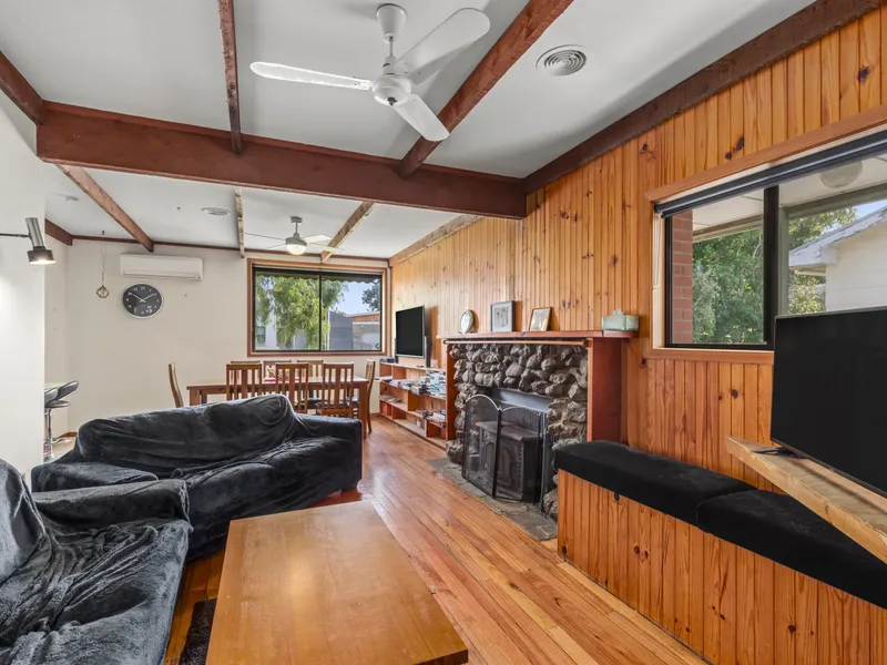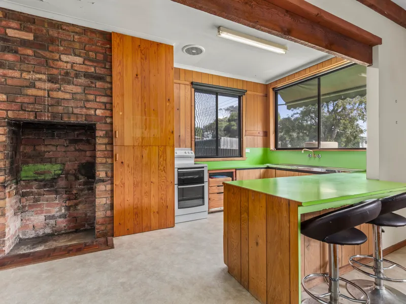 Set on a generous allotment with a desirable northerly aspect, the single-level home combines retro charm with comfortable functionality. Multiple light-filled living areas provide flexibility for families, while the original kitchen adds character and practicality. High ceilings, timber panelled walls, and exposed beams create warmth and a welcoming coastal ambience throughout.