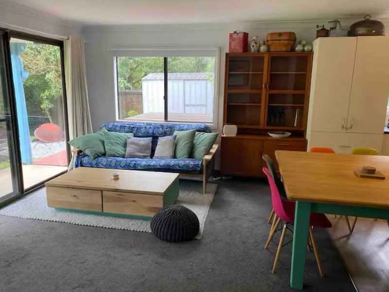 The open-plan living and kitchen area also flows onto the front balcony and is equipped with a 60” television, soundbar, and Chromecast. The kitchen is fully equipped for longer stays, including quality appliances, cookware, and a Nespresso coffee machine, with a convenient servery window opening out to the rear deck.