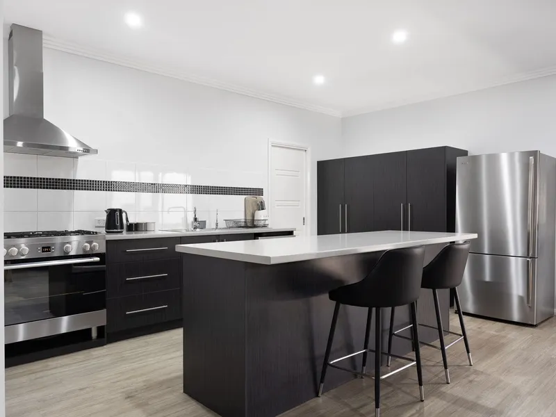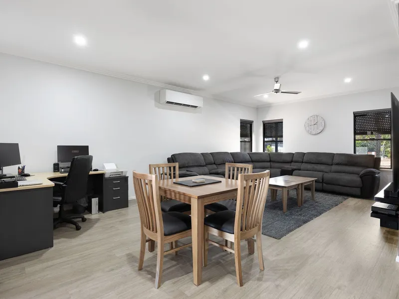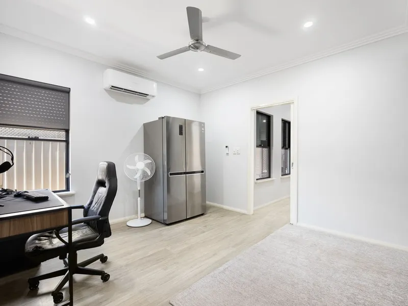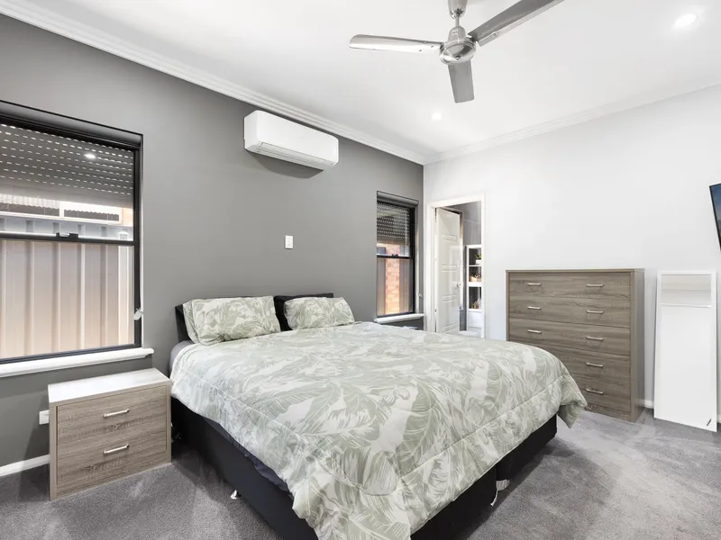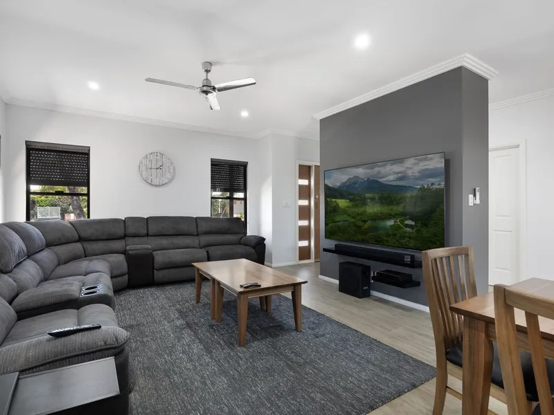 Inside, you'll find a light-filled open-plan living and dining area complemented by split-system air conditioning and ceiling fans for year-round comfort. The modern kitchen features ample storage, quality appliances and a breakfast bar, perfect for everyday living and entertaining.