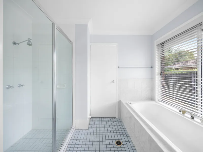 The two-way bathroom is thoughtfully designed with both a separate bath and shower, providing flexibility for families or shared living.